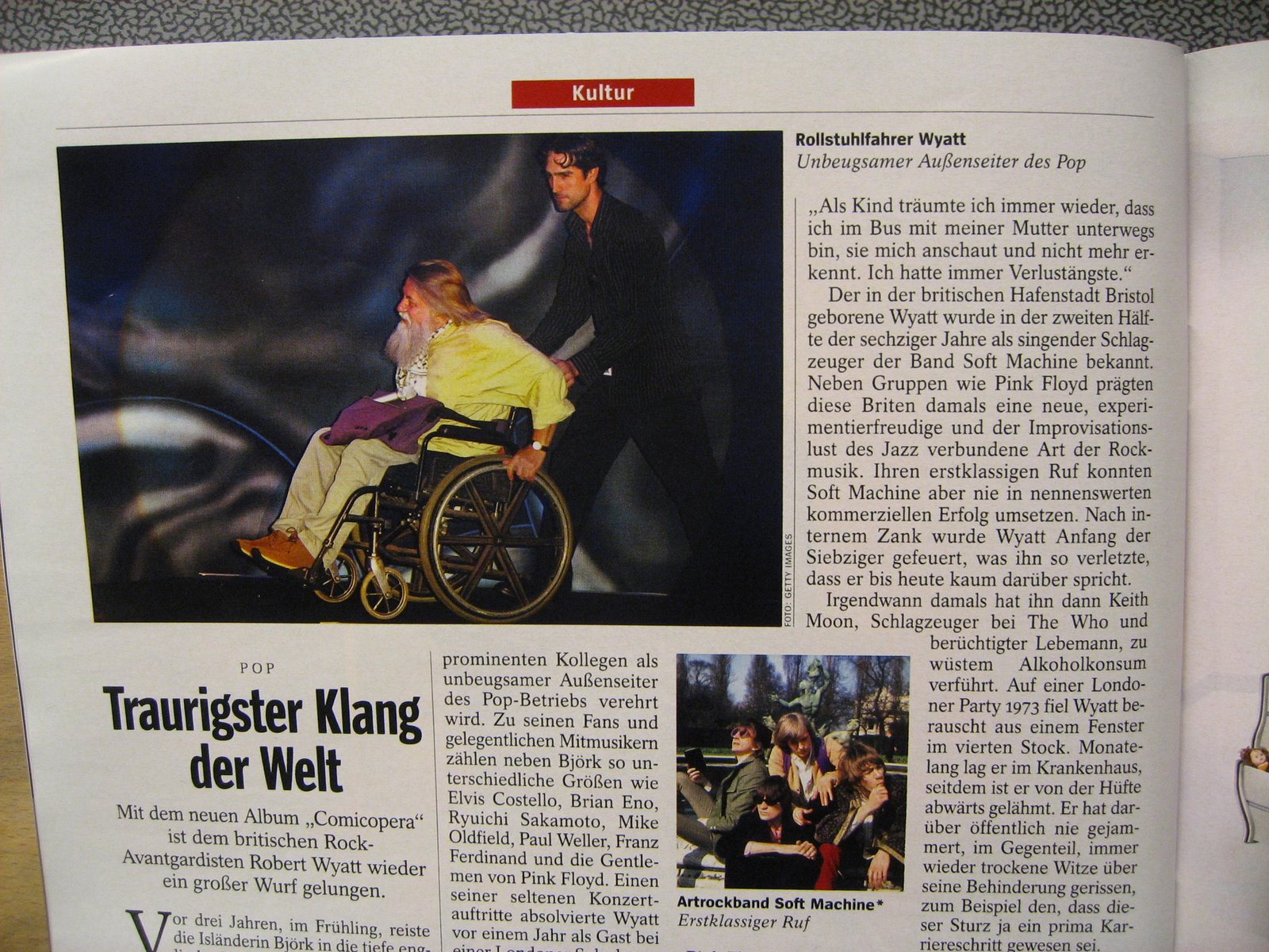 The December/January issue of Norwegian jazz-magazine Jazznytt ("Jazznews") is out now. Just look at the front cover! Inside it is 6 pages on our man, by Stuart Nicholson (translated to Norwegian) and Alfreda Benge (photos, called "Alfie Wyatt"). The title of the piece means "The voice from the wheelchair", and Nicholson states that Wyatt's music is not usually called "jazz", but it is! In the interview Wyatt says he is thinking more in the direction of "folk music" these days. Norwegians to the newsstands now!