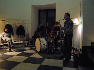 The concert was 70 minutes of contemporary folk (or something!). We got long stretches of very quiet music, before Apeland started to move furniture around, Økland headbanged while playing the violin and Skarbø was hidden behind the drum set, doing spooky percussion stuff on the floor, and then back to normal again. Relaxing, exciting and fun! A great concert for just a small audience (20 - 25 people).