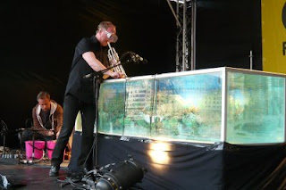 OFFONOFF. Paal Nilssen-Love (dr), Terrie Ex (g) and Massimo Pupillo (b) came running on to the stage (true), counted and got going at full steam with their "punkrockimpro" (as the festival calls it). They play more rock than jazz, and more noise than rock, and it's great fun all the way. Paal Nilssen-Love is sweating liters, and dries himself by hugging friends after the show! Yach!