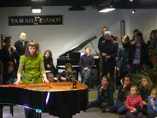 I really like the way the Borealis festival in Bergen use different arenas for their concerts. Tuesday they really got going, and i managed to hear and see Norwegian author Mette Karlsvik in the public library, the opening of the exhibition "Catabolizer" by Gerhard Eckel in the Lydgalleriet, the opening concert "Helios Nordwärts" by Gerhard Stäbler (composed for orchestras, fire engines and helicopters) inside and outside a hotel, a nice concert by Else Olsen Storesund (picture) (works by John Cage and Storesund) in a piano store and then concerts in the homes of families in the Kalmarhuset building!