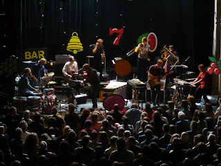 Finally Jaga Jazzist was in town for Bergenfest (five years since last time they were here), and they sure did a fine concert at a packed Logen Teater (no missing "h" there, it´s called this in Norwegian) in Bergen yesterday. The stage was decorated like the cover (and promo material) for "One armed bandit", and they played most of the material from this one.