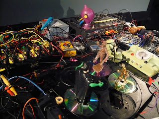 The technical part of this festival is way beyond what I can grasp, but I enjoy looking around! I did not participate in a workshop where you could build a capitalistic robot (!), but saw a couple of exhibitions (see top picture of Jorge Luis Crowe´s installation and warning) and went to two live happenings, where I got some noise, some strobe lights, some live coding with map visualizations and even some work on a "autonomous hyperspace mathematical model" by Claude Heiland-Allen.