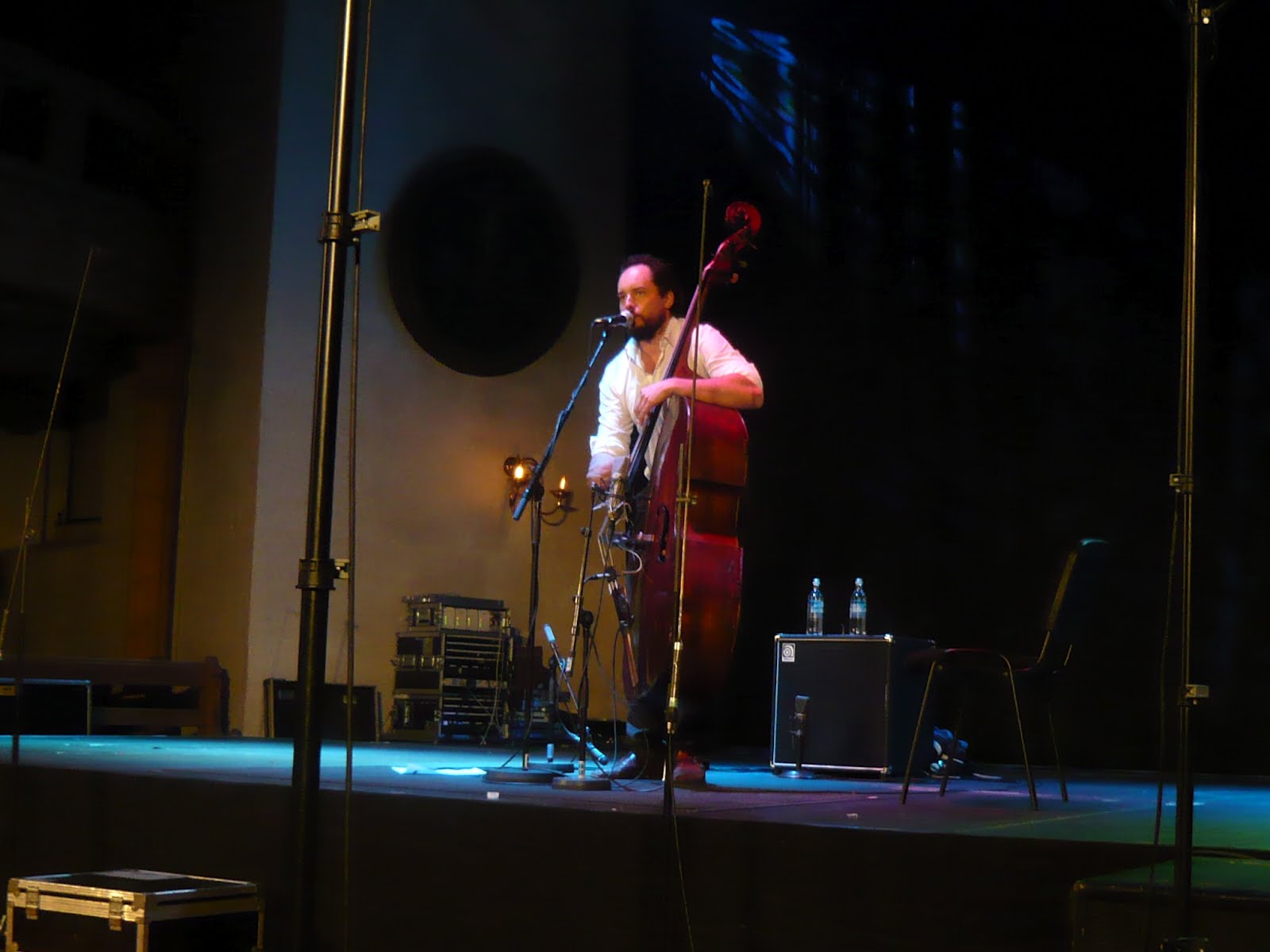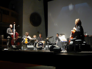 Arve Henriksen "Tidssoner for trompet og treverk". Folk jazz with super band and fantastic lights/video. Arve Henriksen (tp, voc), Nils Økland (viol, Hardanger fiddle), Gjermund Larsen (viol, Hardanger fiddle), Audun Kleive (dr), Svante Henryson (cello), Mats Eilertsen (b), Tord Knudsen (video) and Geir Østensjø (sound). I believe this project is recorded, at least I hope so.